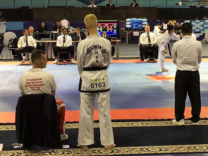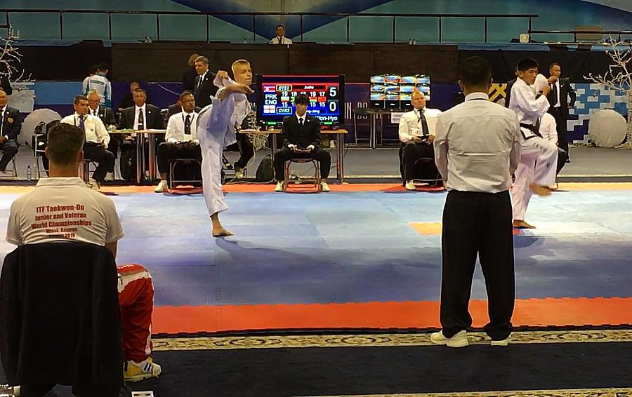 He performed his patterns well and scored close to the competitor from North Korea, but both Jacob and his Coach, Paul Harwood, noticed that Mun Jong Ryong had performed an incorrect kick during his chosen pattern of Juche. The resultant video appeal led to an extended review by the judges with the decision being referred to the Competition Referee for a final decision. The decision was in favour of Mun Jong Ryong and led to an extended umpires meeting that stated that during this competition a reverse side kick foot position would be accepted for Juche.