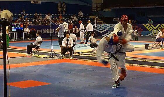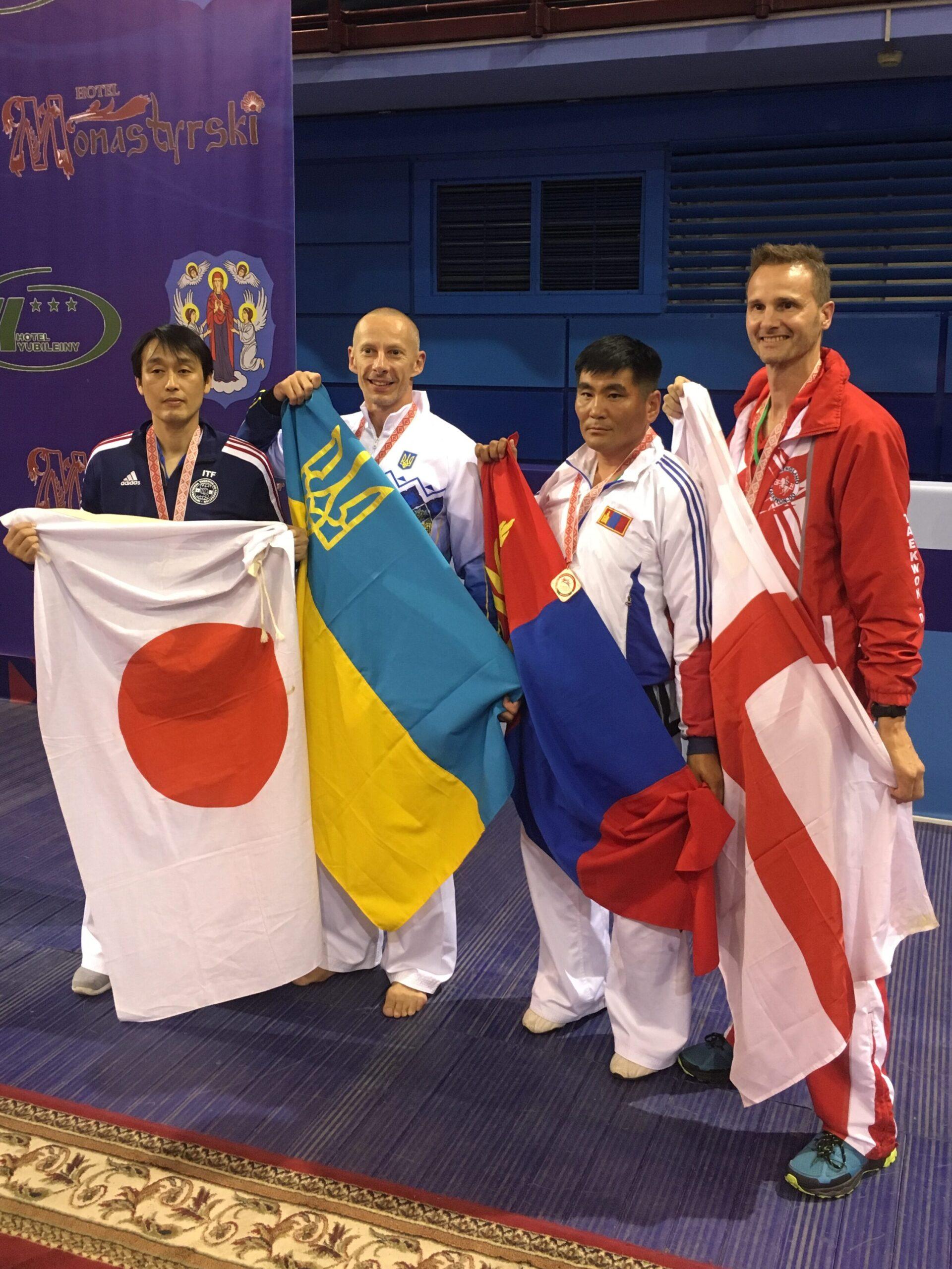 I made good progress in the Veterans 3rd Dan Patterns. I had the benefit of a “by” in the first round and a second round win against Yevhen Kuchmistyi from the Ukraine. The semi final match against Sato Nozumo did not go in my favour, leaving me with a World Championship bronze medal.